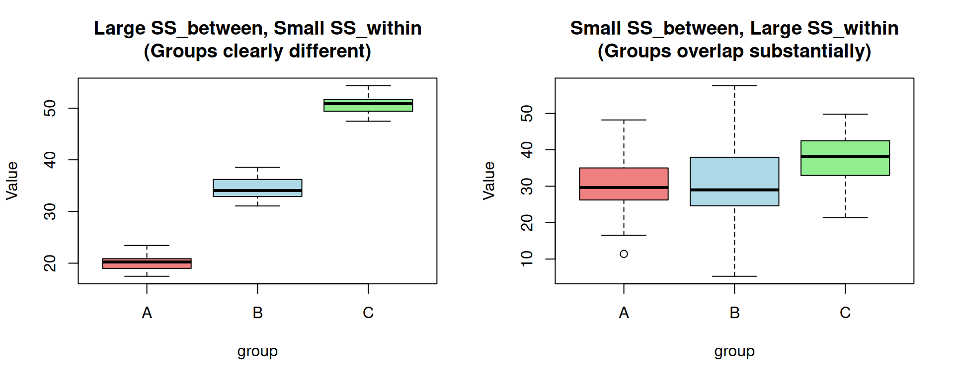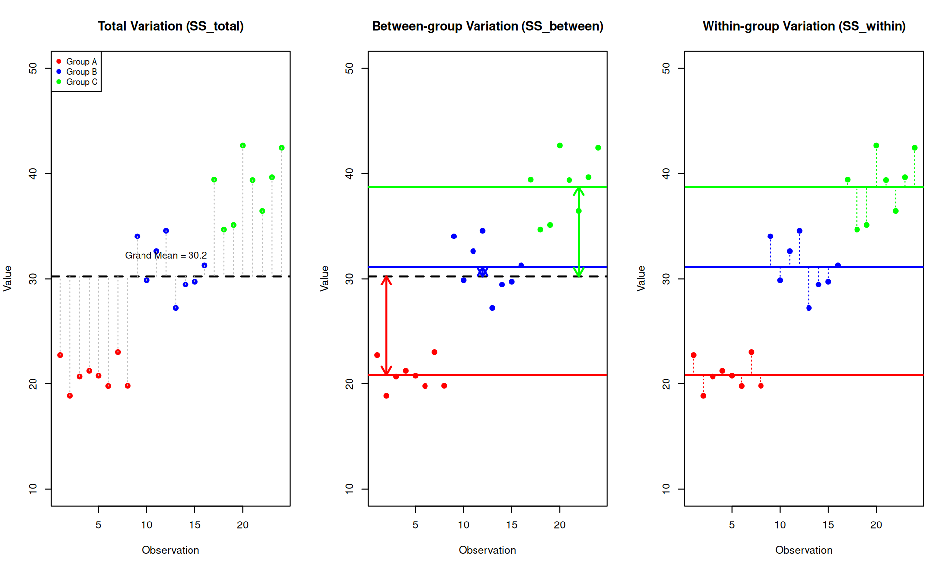 Within-group variance measures how much individual observations vary around their own group mean. It answers: “How spread out are observations within each group?”