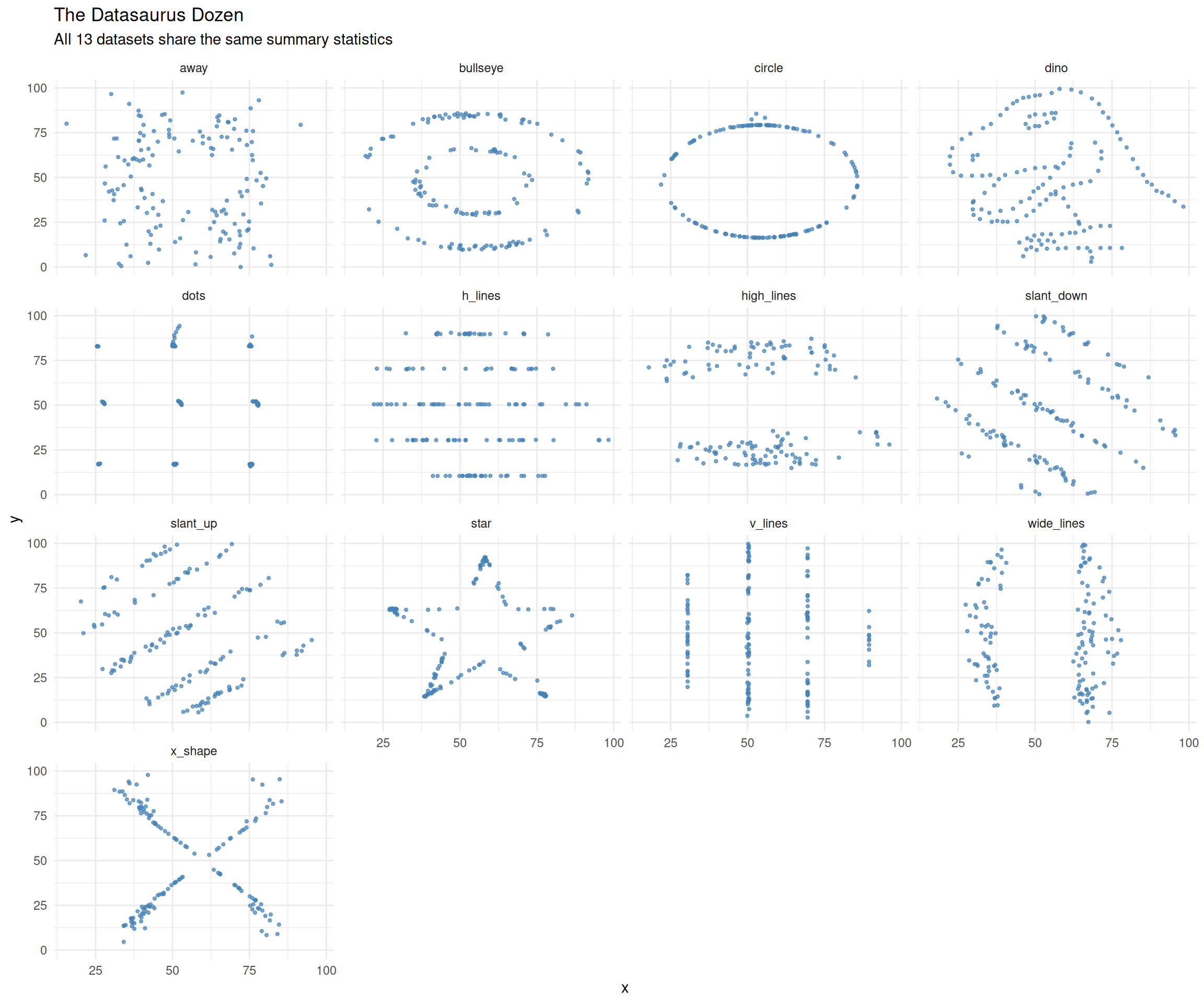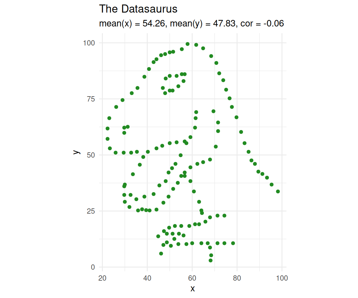 In 2017, Matejka and Fitzmaurice extended Anscombe’s idea by creating 13 datasets that share the same summary statistics (to two decimal places) but produce wildly different scatter plots — including one shaped like a dinosaur.