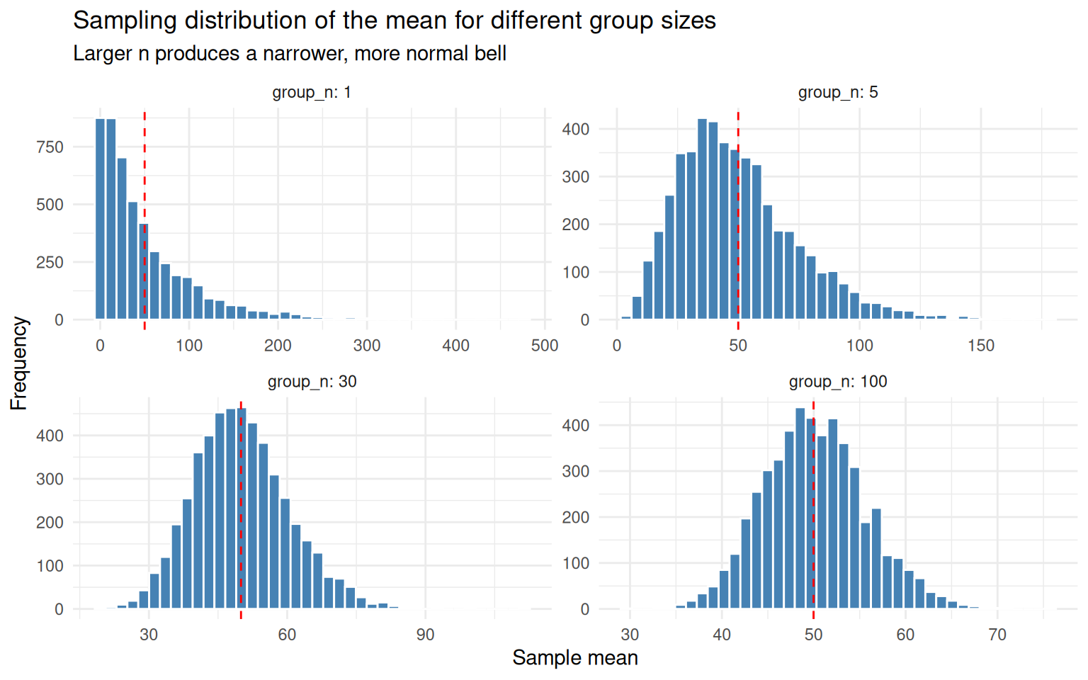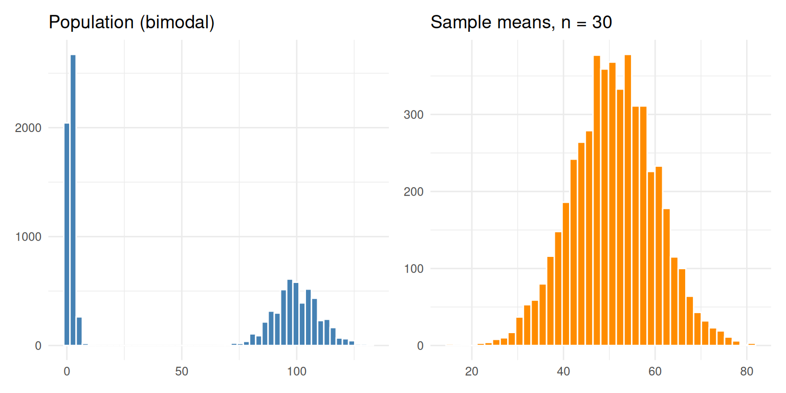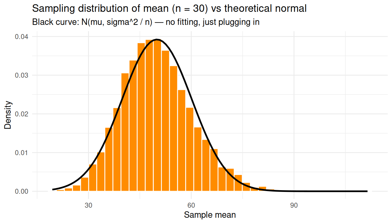 The CLT says no. A single sample of \(n\) dishes is enough. Here is why: the CLT promises that the sampling distribution of \(\bar{X}\) is approximately \(\mathcal{N}(\mu,\ \sigma^2/n)\). So once you have one sample, you can estimate