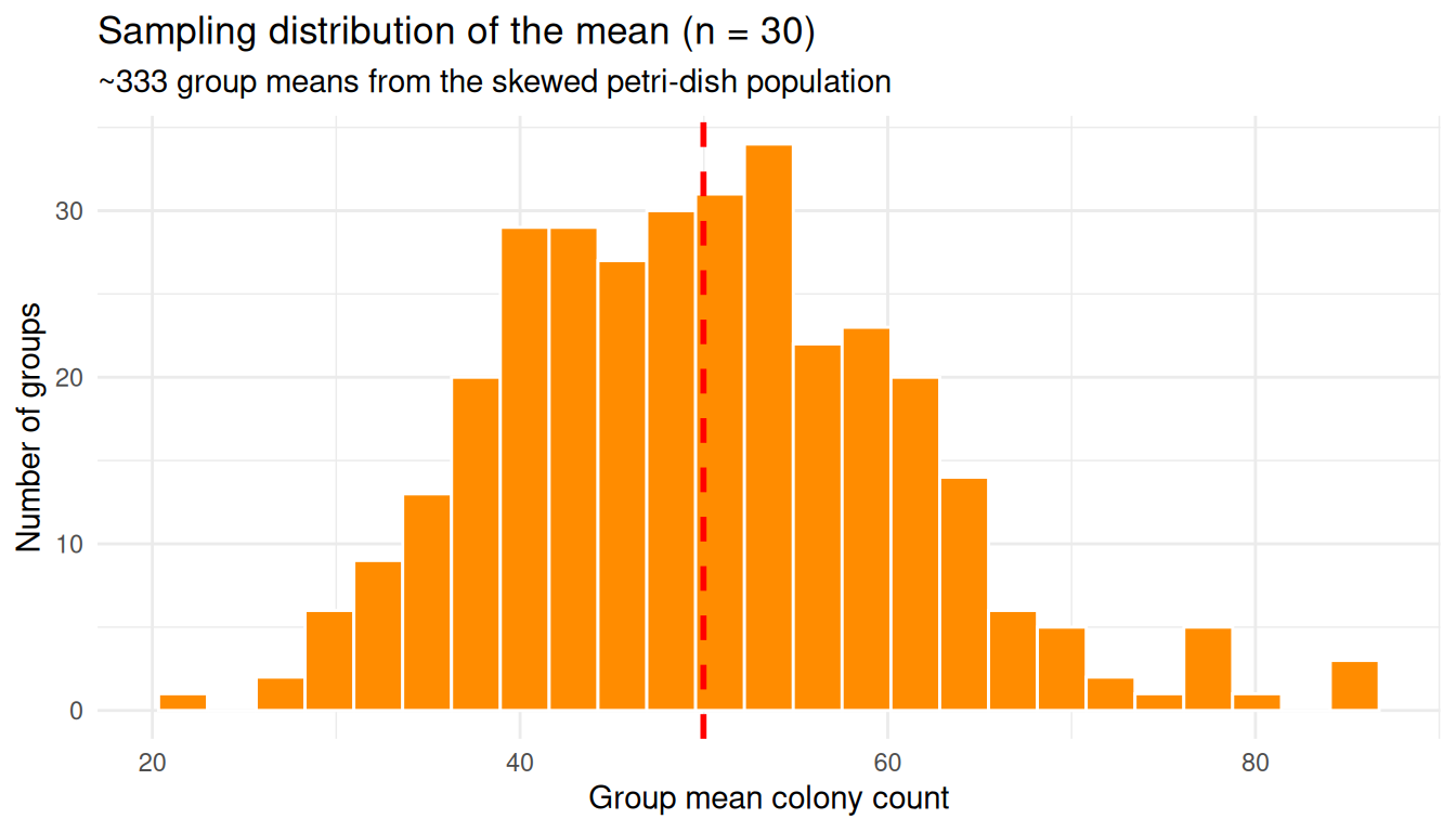 We have spent the whole notebook simulating thousands of replicates because we wanted to see the sampling distribution of the mean. But what if you actually had to run this experiment in the lab? Do you need to repeat it 5,000 times — or even just five times — to estimate the mean colony count and how precise that estimate is?