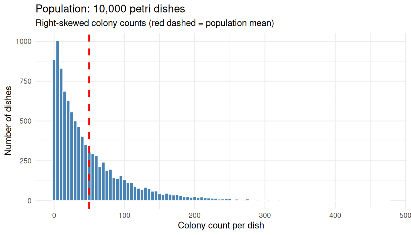 Picture 10,000 petri dishes, each holding a highly variable bacterial colony count. The dish-to-dish counts are very spread out and skewed to the right: most dishes have a modest number of colonies but a handful have huge counts.