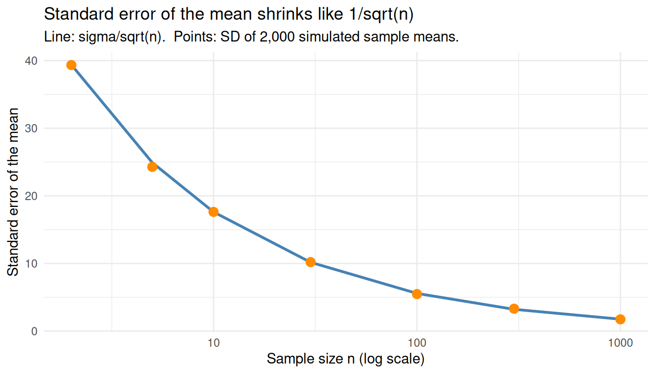 Strategy A’s CI is roughly \(\sqrt{5} \approx 2.24\) times wider than C’s. That matches the \(1/\sqrt{n}\) rule: going from \(n = 30\) to \(n = 150\) is a 5× increase in \(n\), which shrinks the SE by \(\sqrt{5}\).