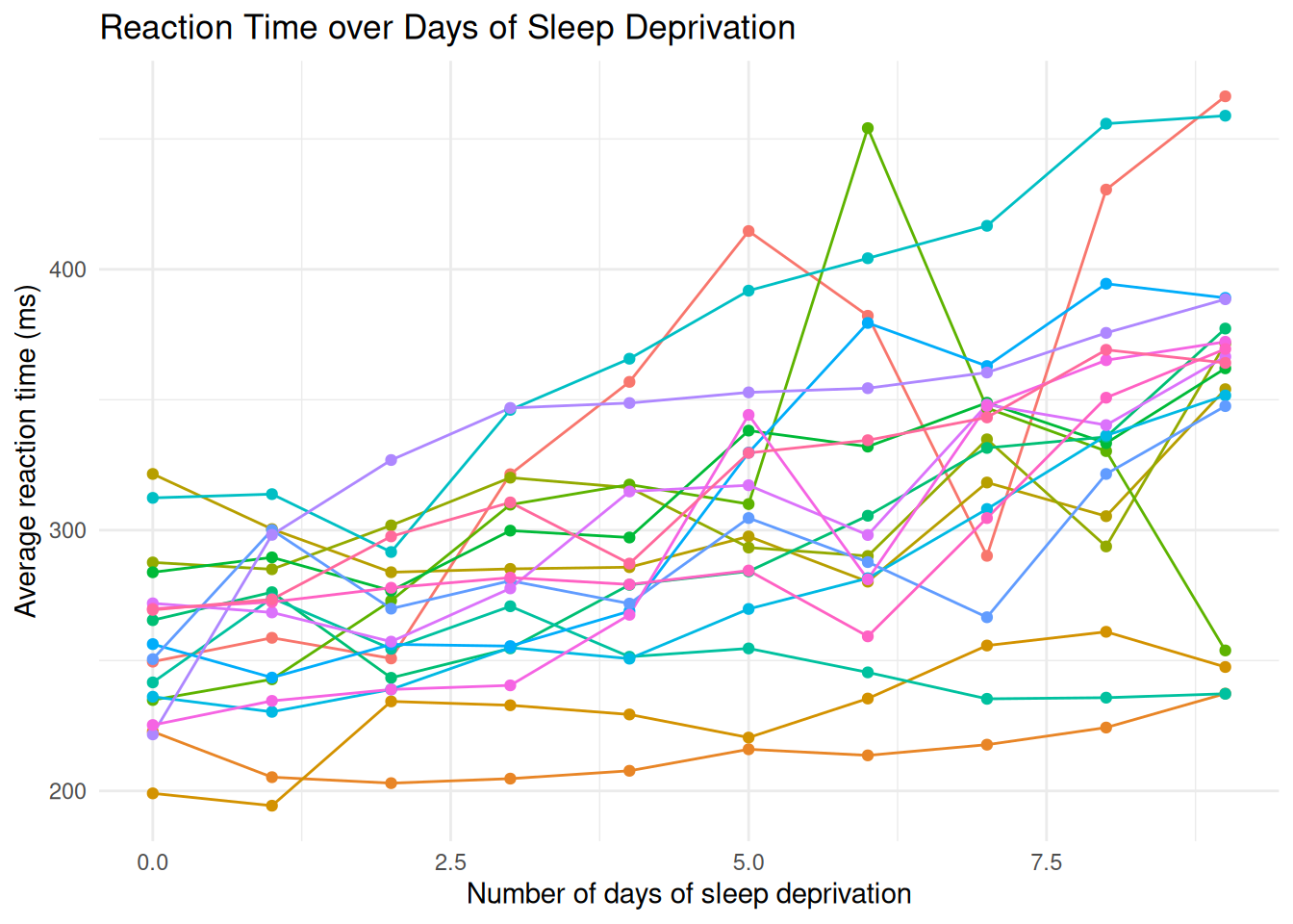 Each subject has their own baseline reaction time, but we assume the same slope (same rate of slowing down).